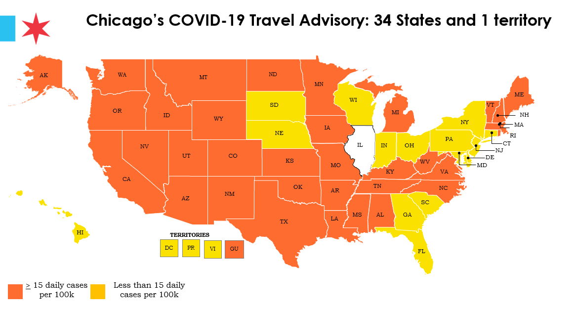 Chicago usunęło 12 stanów z pandemicznej mapy USA. Podwyższone ryzyko zakażenia koronawirusem utrzymuje się – zdaniem miejskiego departamentu zdrowia- w 34 stanach i na obszarze jednego terytorium zależnego od Stanów Zjednoczonych. Za takie rejony uznaje się te, gdzie na 100 tysięcy mieszkańców przypada więcej jak 15 nowych zakażeń. We wtorek z wykazu stanów o podwyższonym ryzyku usunięto: Connecticut, Delaware, Florydę, Georgię, Hawaje, Indianę, New Jersey, Nowy Jork, Pensylwanię, Karolinę Południową, Dakotę Południową i Wisconsin. Wszystko wskazuje na to, że w przyszłym tygodniu z grupy tej Chicago może usunąć kolejnych 18 stanów.